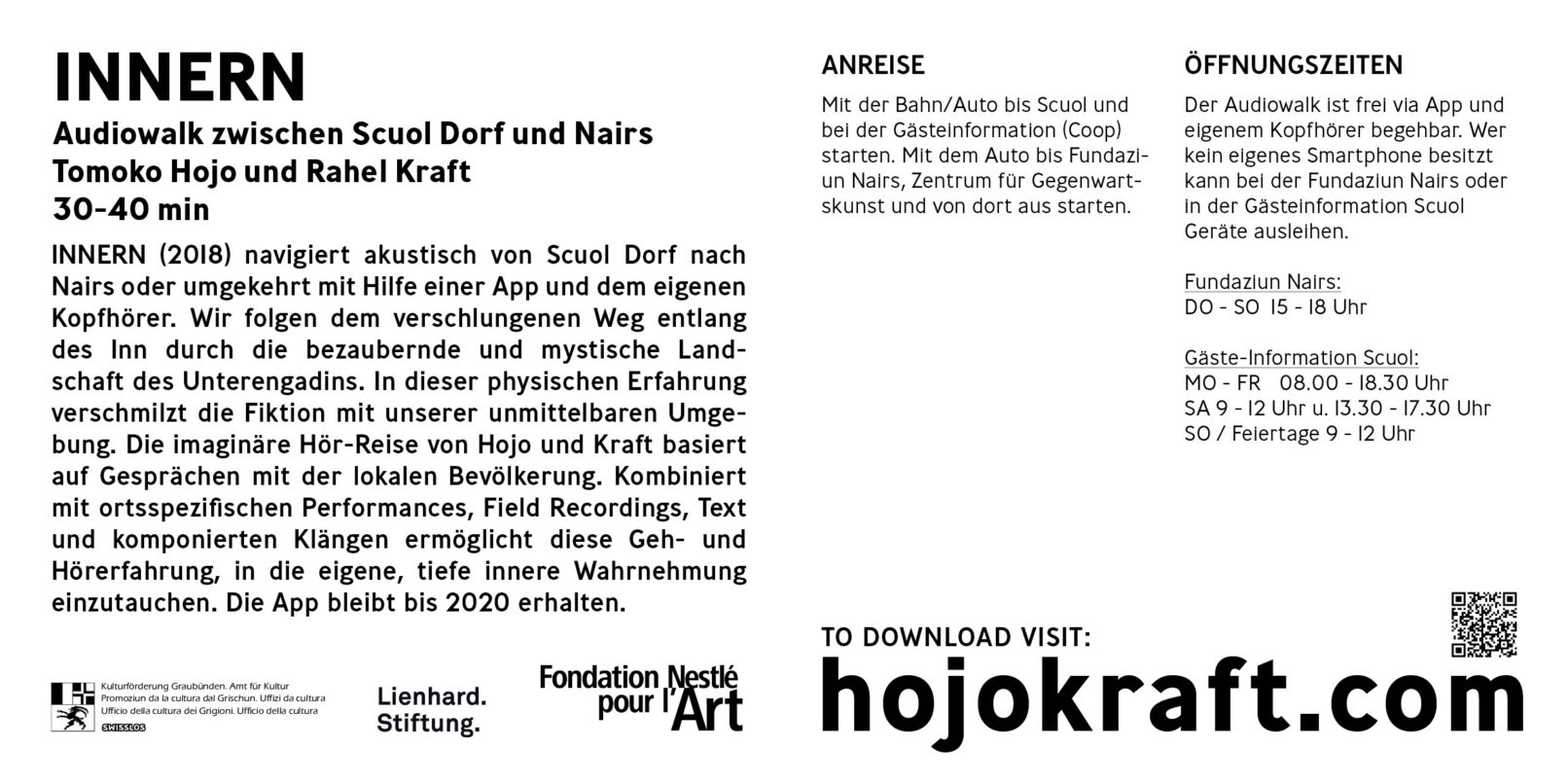INNERN (2018) is a site-specific audiowalk/app created by the sound art collective Tomoko Hojo and Rahel Kraft. It is composed for the hiking path between Scuol and Nairs in the Engadine, a remote area of the Swiss Alps. This walking and listening experience allows one to immerse oneself in one’s own, deep perception. Each composition is located to a site and activated via GPS (geolocalisation).